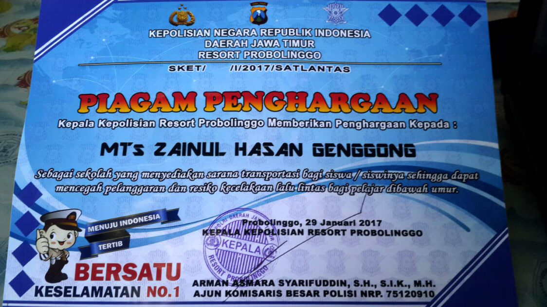 Dalam kegiatan apel tersebut, terasa lebih spesial bagi MTs. Zaha Genggong. Pasalnya, dari semua lembaga SMP/MTs. yang menghadiri apel tersebut, MTs. Zaha Genggong menjadi satu-satunya lembaga yang mendapat piagam penghargaan langsung dari Kapolres Probolinggo, AKBP Arman Asmara Syarifuddin. Piagam penghargaan tersebut diberikan sebagai bentuk apresiasi Kapolres terhadap MTs. Zainul Hasan Genggong yang telah menyediakan sarana transportasi bagi siswa sehingga dapat mencegah pelanggaran dan risiko kecelakaan lalu lintas bagi pelajar di bawah umur. (Gus/Fin)